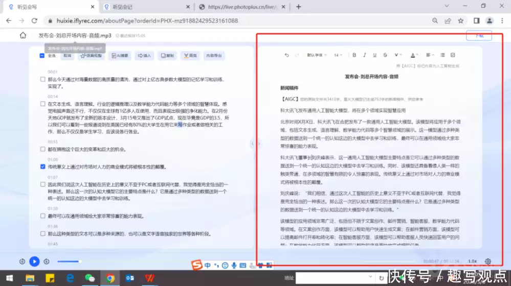 而听见会写更是让我们这样的文字工作者开心不已。在外采访、参会时,要实时背着电脑记录写稿是件把人逼疯的事,而“大模型+讯飞听见”,可以实现会议或者采访录音30秒就生成文字稿件,而这并非简单的语音转文字,而是带着“脑子”在分析完文字内容后,一键可以生成全文摘要、工作待办、工作计划、新闻稿件、宣传文案等多种文本。在5月6日发布会上,刘庆峰发介绍大模型后,讯飞听见会写立刻写出了一篇新闻稿件。即便是再熟练的记者也没有它快,用讯飞听见抢头条没得说。