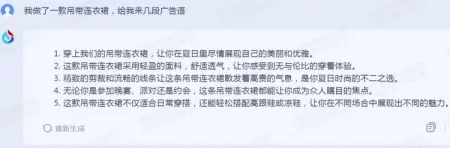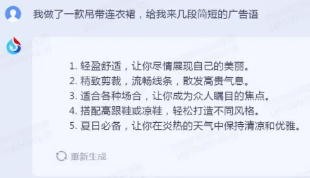 我的朋友是一位才华横溢的服装设计师,常常为了创作一句吸引人的广告语而苦思冥想。最近,他决定借助讯飞星火的文案创作能力,终于找到了一款既能突显夏日连衣裙的轻盈透气、又能体现面料与剪裁之美的广告语。虽然最初的设计有些超出了他的预期,但是经过讯飞星火的精炼,最终呈现出的广告语既简洁又精准,完全符合他的需求。为了满足不同消费者的口味,我的朋友又让讯飞星火为其提供了另一个简短的广告语。这个广告语是对之前五个回答的精髓所在,简洁明了,几乎达到了一蹴而就的境界。这样一来,消费者可以根据自己的喜好选择不同的广告语,更好地传达产品的优势。