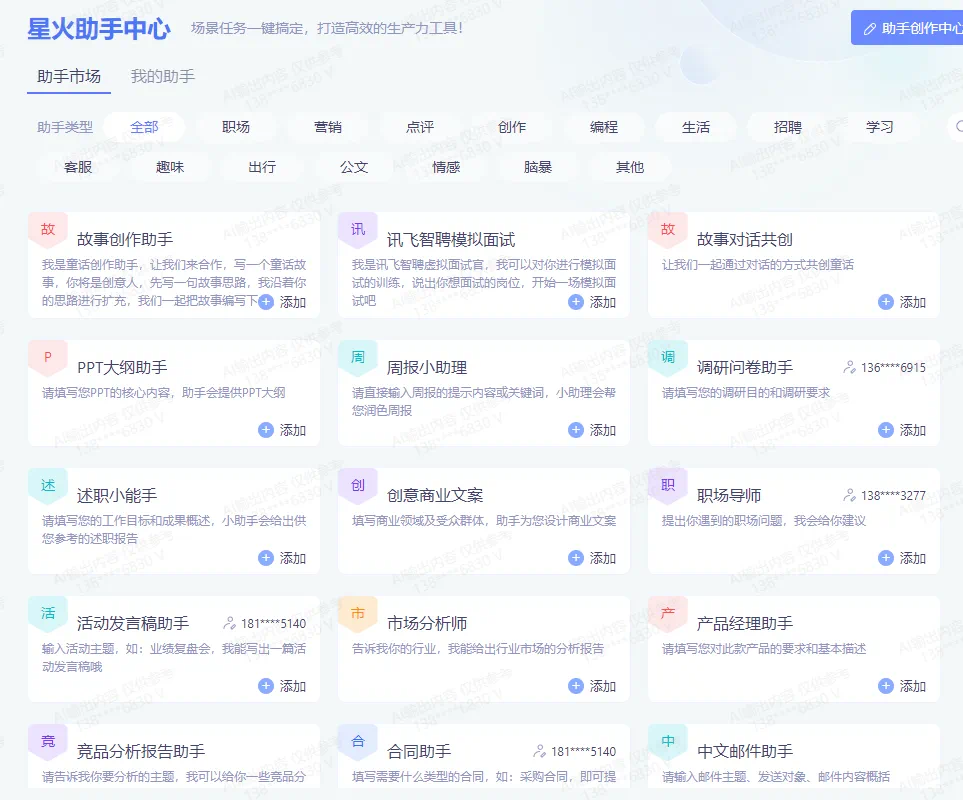 发布会现场,星火还发布了APP产品,实现大模型在手机端交互体验提升。与此同时,200+小助手正式上线星火APP,打造全新Prompt“应用开发”场景,深入职场、生活、出行、写作等用户高频场景,不仅支持个性化定制,还支持创作发布和分享。