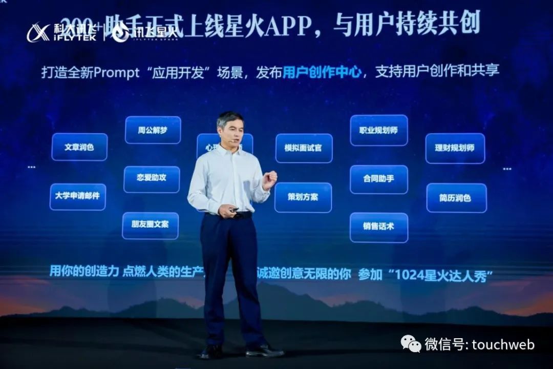 “我们可以随时随地通过APP使用星火的能力,通过更多的助手在生活中提供各种各样的帮助。”吴晓如会上面向广大用户发出邀请,“欢迎更多有创意的合作伙伴加入到星火的共同的创意中,参加‘1024星火达人秀’,用你的创造力点燃人类更大更强的生产力。”