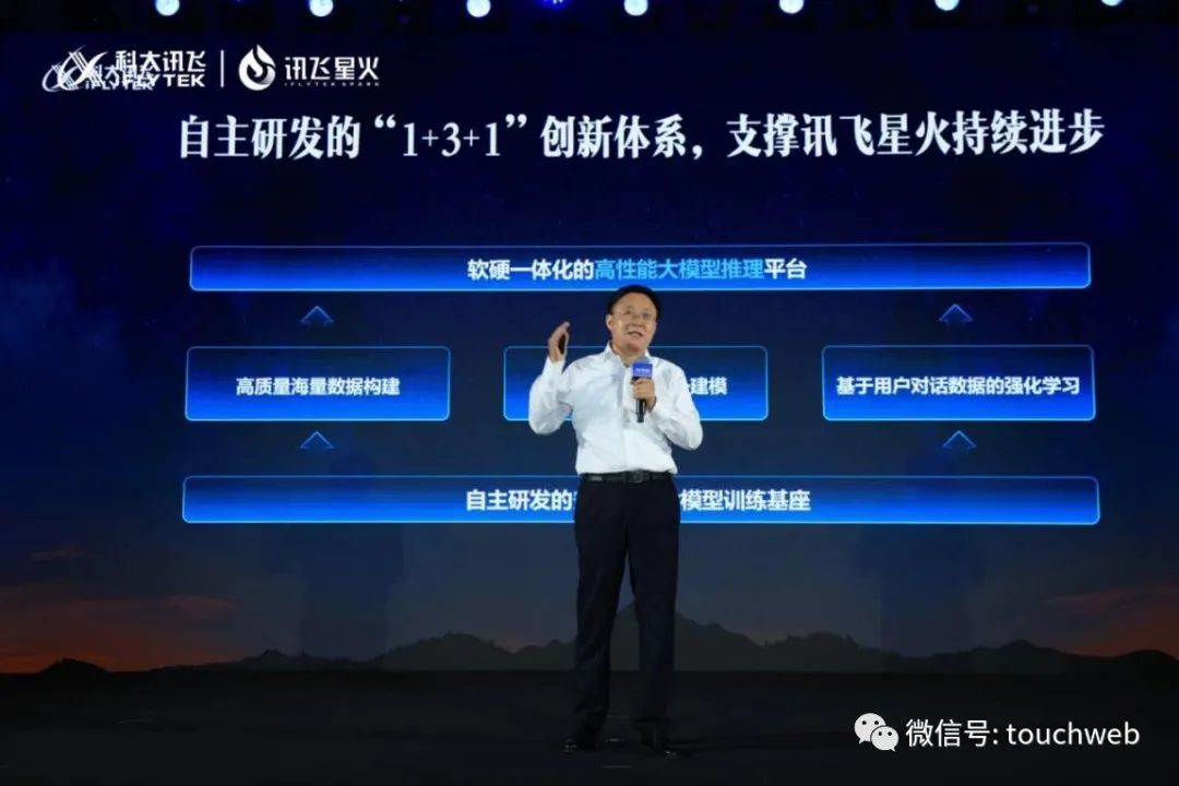 讯飞称,支撑讯飞星火持续进步的是“1+3+1”创新体系,具体是依托自主研发的安全可控大模型训练基座,通过海量数据和知识构建、多语种多任务统一训练,以及基于用户数据的强化学习,构建软硬一体化的高性能大模型推理平台。
