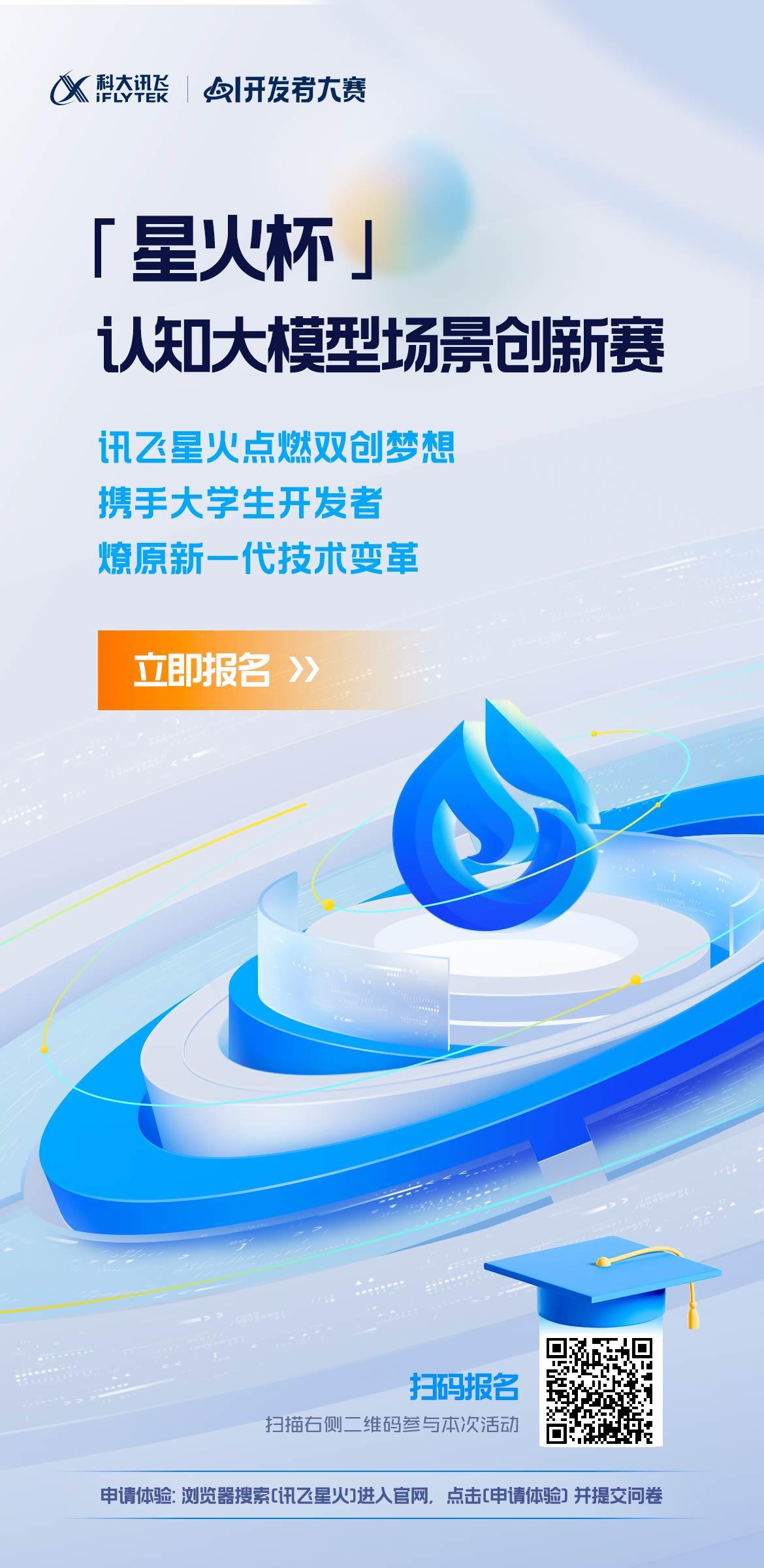 “星火杯认知大模型场景创新赛”以及AI开发者大赛GPT类应用赛题已开启报名,期待各位技术爱好者们能够发挥自己的创造力和想象力,致力AI智能应用创新,构建围绕大模型智能化应用的全新生态体系,一起开创AI技术的新篇章!