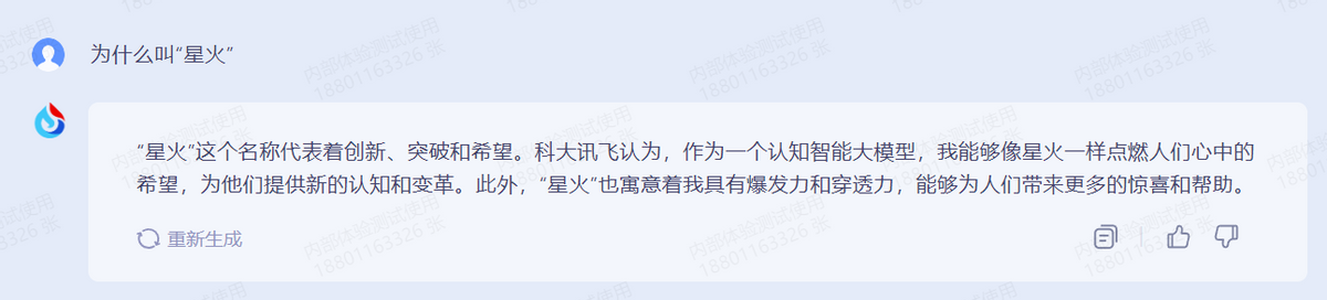在整体上,我们可以看到“星火”对于自身认知有着相当清晰的掌握,特别是在解释名称来源方面,展现出了清晰的逻辑顺序。作为科大讯飞的大模型,它明确地表达了对人工智能领域的热切期待。另外,在回复速度方面,当以中文展示时,“星火”没有出现任何延迟的情况,其流畅性令人印象深刻。