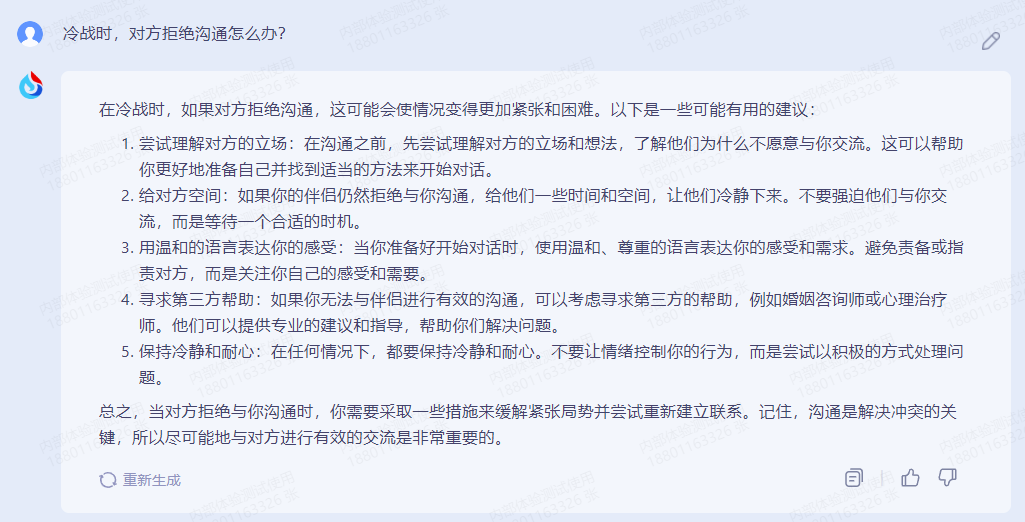面对棘手的两性问题,“星火”的回答还是很合情合理的,能够围绕“沟通”给出十分具体实用的建议。在EQ方面也有着不错的表现。