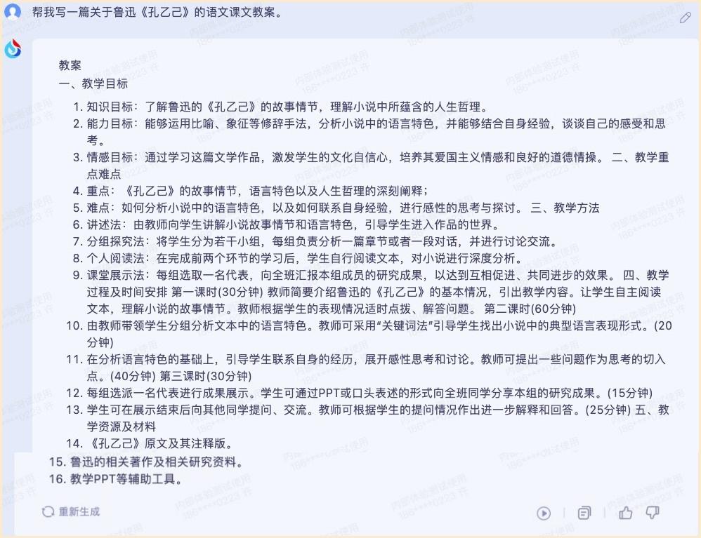 在内容和生成能力方面,IT之家首先让讯飞星火撰写一篇关于鲁迅《孔乙己》的课文。令人惊喜的是,讯飞星火成功地完成了这篇课文的撰写。