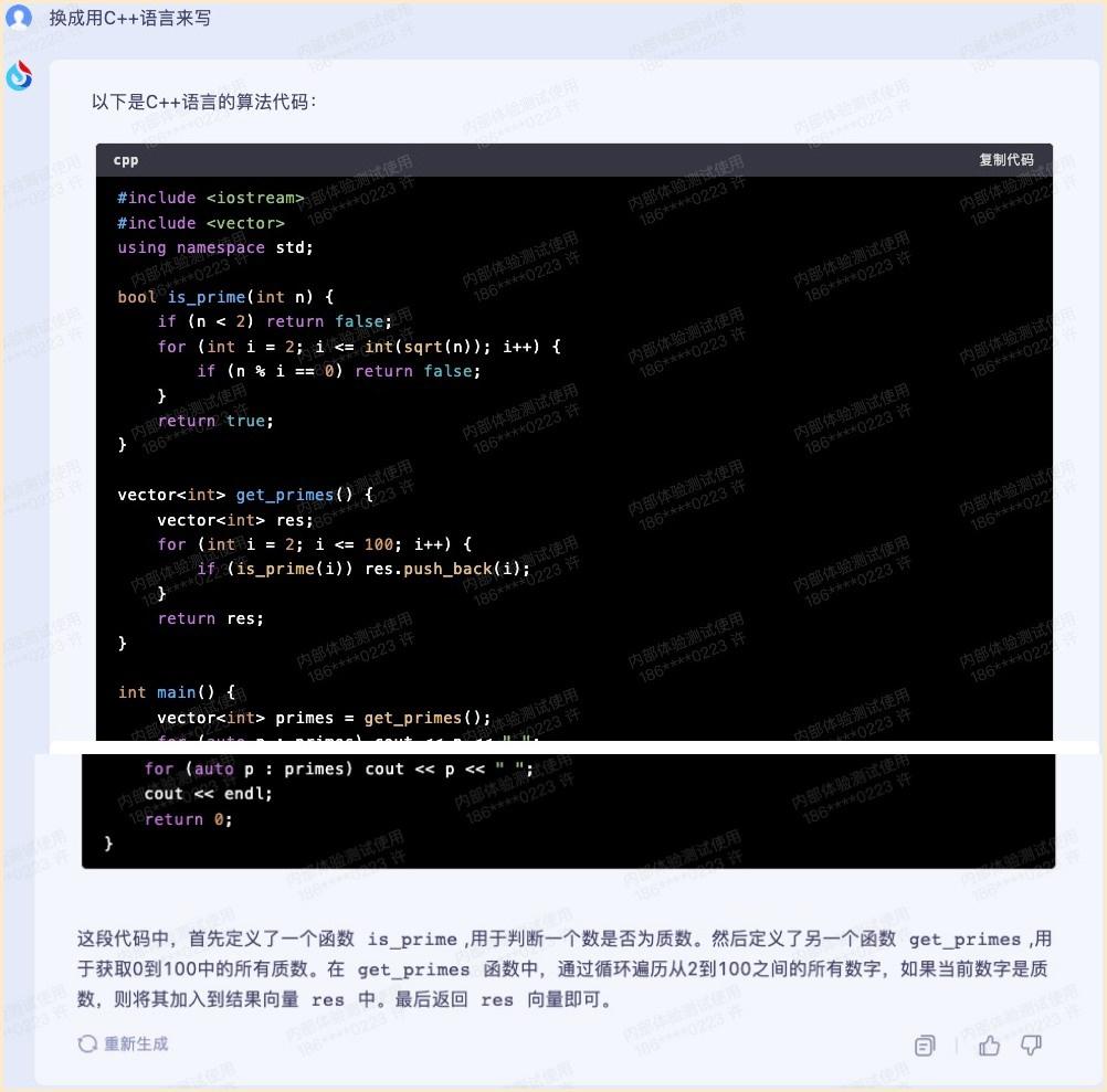 接着小编直接说“换成用 C++ 语言来写”,它又很快给出了用 C++ 语言实现的代码,非常方便。