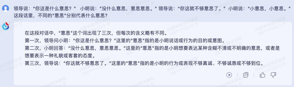 逻辑能力没问题,那么语言理解能力呢?小编又找了一段话进行测试,可见下面这段绕口令一样关于“意思”的段子,讯飞星火准确理解了每个“意思”代表的含义。