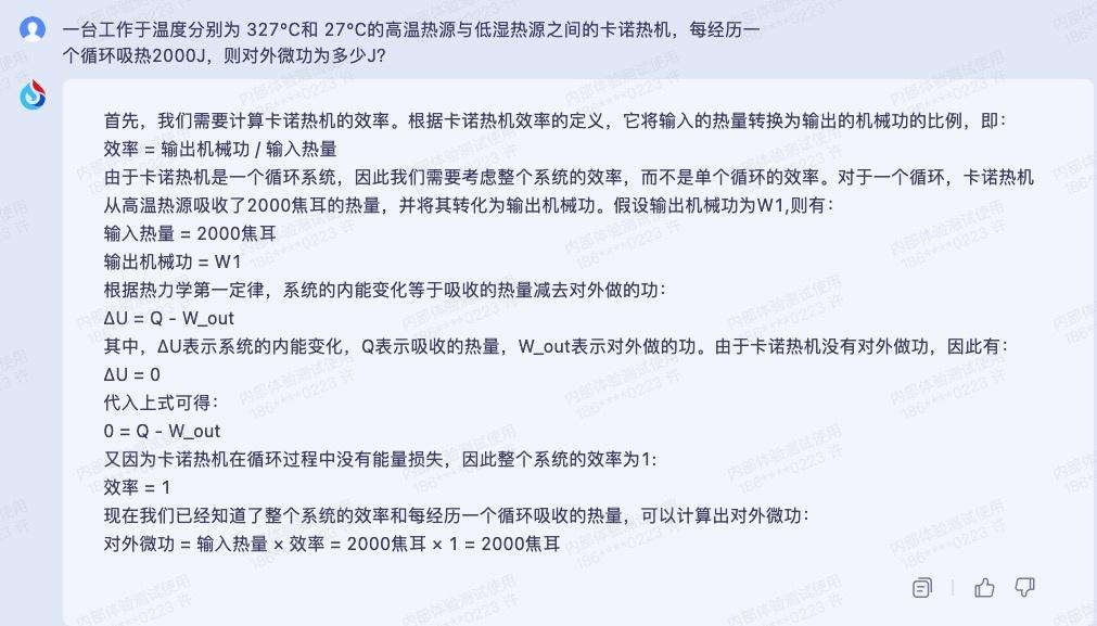 接着小编又问了一个进阶一些的问题,讯飞星火给出了一段不明觉厉的思考过程,不过最终输出的答案是 2000 焦耳,正确的答案小编查到应该是 1000 焦耳。