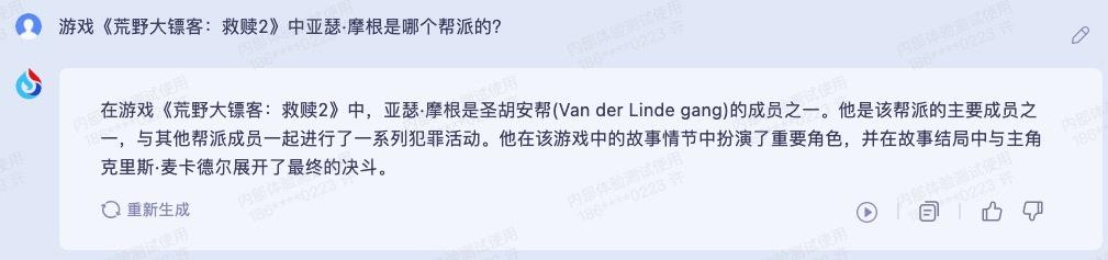 接着小编又问“《荒野大镖客:救赎 2》中亚瑟・摩根是哪个帮派的?”这次的回答中,讯飞星火基本意思回答正确了,但是“Van der Linde”翻译应该是“范德林得”帮,讯飞星火答成了让人一脸懵的“圣胡安帮”。